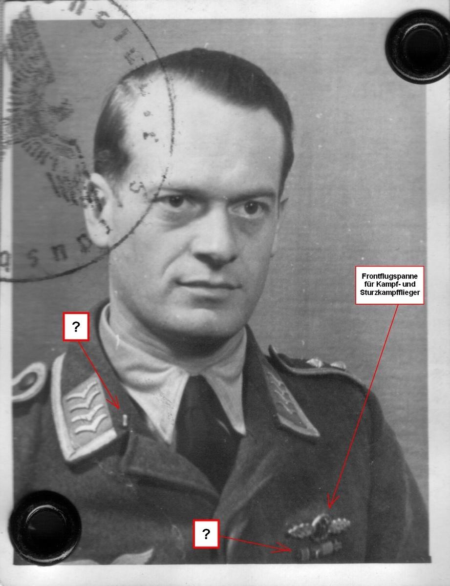 Bild 2: Passfoto aus dem auf Juni 1944 datierten Navigationslehrer-Schein (Das Foto muß aus dem Zeitraum zwischen 1942 und 1944 stammen; nach einer uns vorliegenden Heimkehrererklärung eines Kameraden aus dem Zeitraum 1944/1945 scheint mein Großvater aber schon zuvor als Ausbilder/Lehrer mit Themenschwerpunkt Navigation tätig gewesen zu sein: Genannte Orte Straßburg, Navigationsschule Strausberg, Breslau, Luftkriegsschule Straubing,...)
